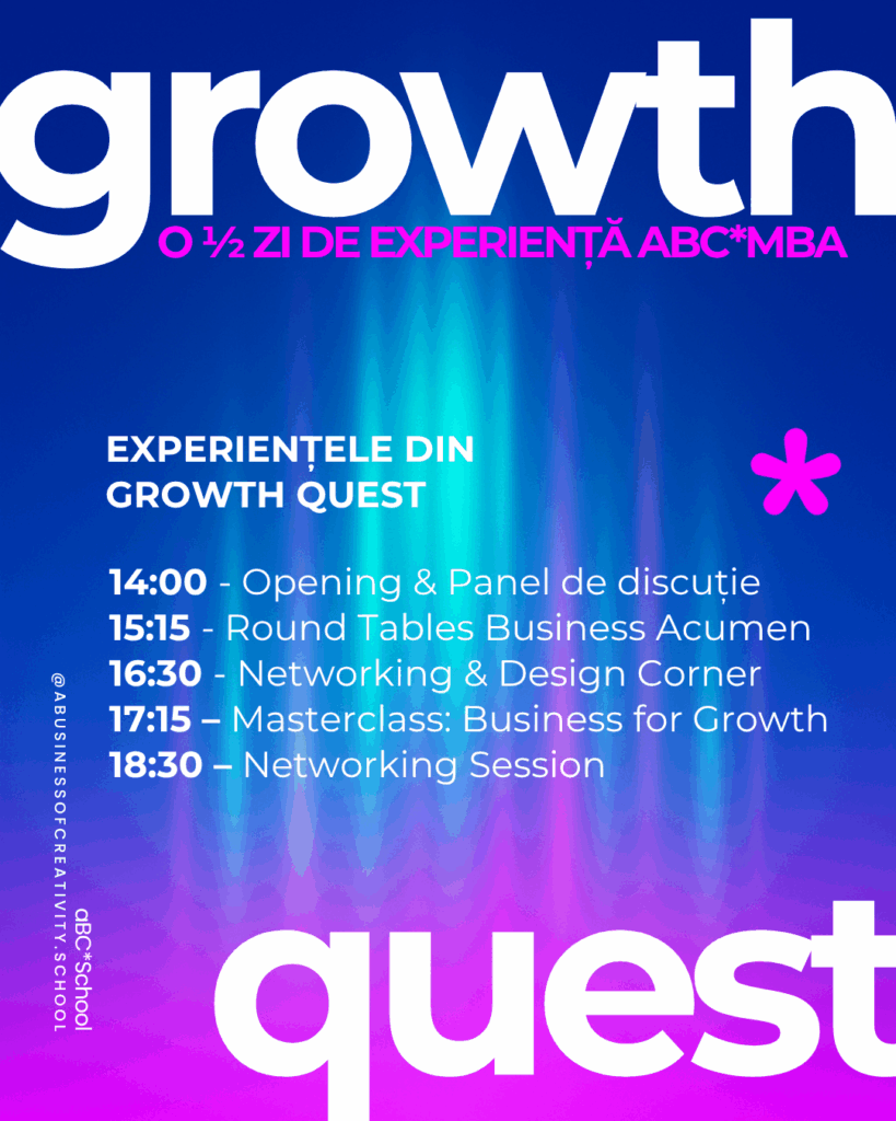 Growth Quest este o conferință interactivă marca aBC*School, parte din ecosistemul ABC • a Business of Creativity, care aduce la un loc experți, alumni și viitori lideri ai industriilor creative într-un format participativ, cu mese rotunde tematice, un masterclass inspirațional și un corner dedicat alumni programului de mini*MBA.