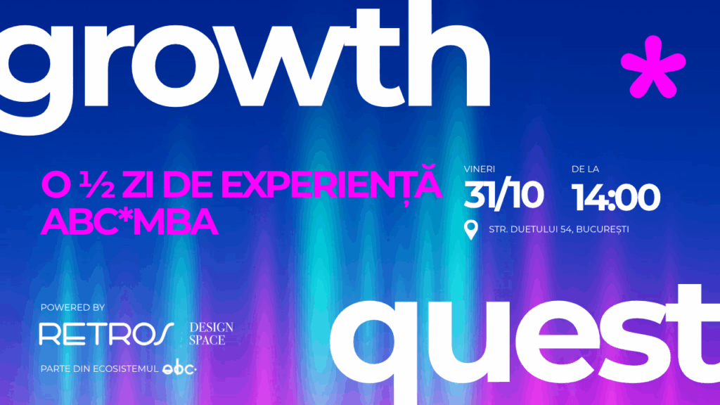 *Growth Quest este o conferință cu acces gratuit powered by Retros Showroom, creată pentru comunitatea aBC*School, parte din ecosistemul ABC. *Pentru a participa la Growth Quest este nevoie să te înscrii.