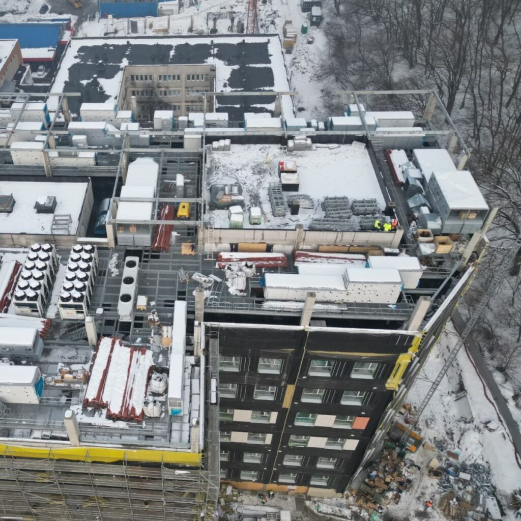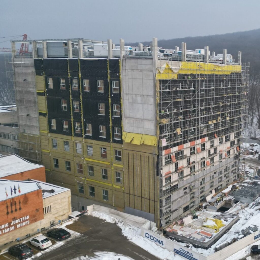 La Institutul de Urgență pentru Boli Cardiovasculare și Transplant Târgu Mureș, lucrările avansează rapid. Noua clădire din elemente prefabricate completează spitalul județean și celelalte corpuri: centrul de transfuzie, secția de terapie intensivă și centrul de arși, conform informațiilor publicate de Tesseract Architecture.